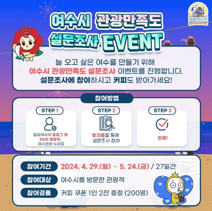 설문조사는 관광 홈페이지, ‘힐링 여수야’(여수 공식 관광 SNS) 블로그, 페이스북, 인스타그램, 유튜브 등 온라인으로 실시된다.