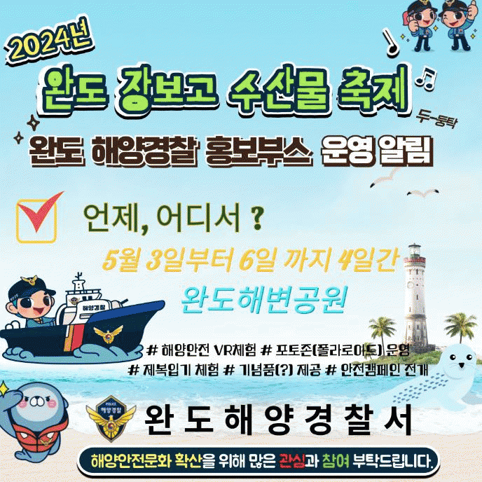 행사내용으로는 해양경찰 제복 입어보기 및 해양안전 VR체험, 위급상황 시 응급처치 방법 및 생활 안전수칙 전파(QR영상) 등이다.