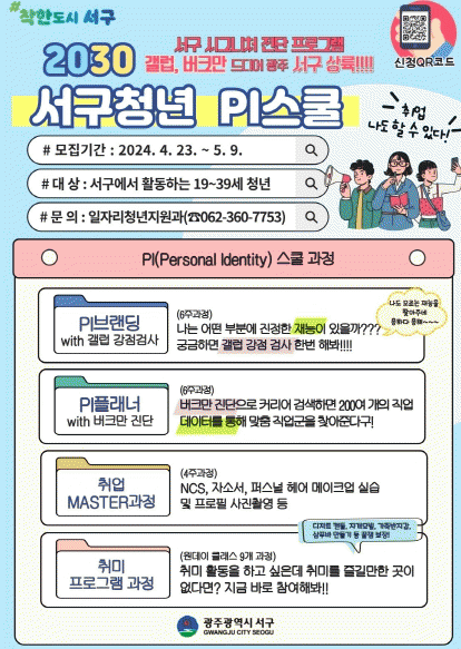 PI(Personal Identity)스쿨은 최근 유행하고 있는 MBTI 검사보다 전문·심화된 것으로 갤럽강점검사, 버크만 검사 등 전문 진단도구를 통해 청년들에게 진로 탐색 기회를 제공하는 프로그램이다. 서구는 이 검사를 통해 청년들 스스로 흥미와 강점, 행동유형을 알아보고 행동유형에 맞게 개인의 진로설계까지 연계할 수 있도록 지원할 예정이다.