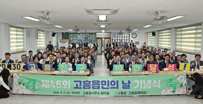 아울러, 고향을 지키며 읍정 발전 및 주민복지 증진에 기여하고 경로효친 사상을 드높인 유공자 3명(지역발전부문 송정석, 사회복지부문 김인자, 경로효친부문 류제흥)에게 표창패를 수여하고, 2030년 인구 10만 달성을 염원하는 퍼포먼스를 읍민과 향우들이 함께해 화합과 결의를 다지며, 올해 46회를 맞는 고흥읍민의 날의 의미를 더했다.