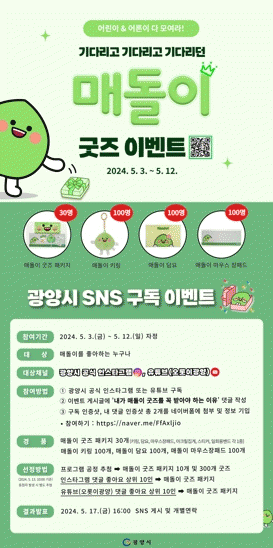 이번 이벤트는 ‘오롯이광양’ 유튜브 채널 구독 또는 인스타그램을 팔로우한 후 ‘매돌이 굿즈 이벤트’ 게시물에 ‘내가 매돌이 굿즈를 꼭 받아야 하는 이유’를 댓글로 작성하고 네이버폼을 통해 인증하면 추첨을 통해 330명에게 다양한 매돌이 굿즈를 증정한다.