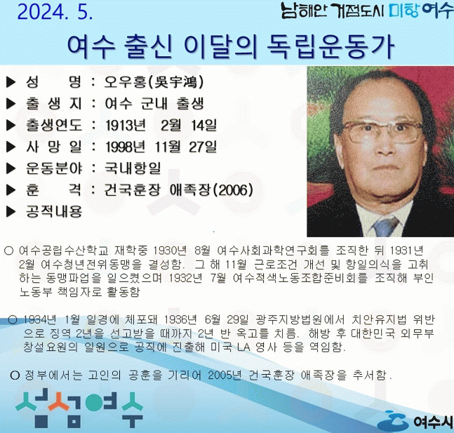 ‘오우홍(吳宇鴻)선생’은 여수공립수산학교 재학중 1930년 8월 여수사회과학연구회를 조직한 뒤 1931년 2월 여수청년전위동맹을 결성했다.