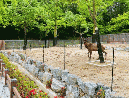 남유럽에 사는 ‘다마사슴의 고향’을 콘셉트로 새단장한 사슴사는 기존의 철조망을 없애고 함정(모트)을 설치해 관람로와 동물사를 구분했다. 또 바닥을 흙과 돌로 바꿔 친자연적으로 개선했다.