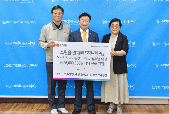 정기명 여수시장은 “저소득 아동을 위해 지속적으로 후원해 주신 LG화학에 감사를 드린다”며 “아동들이 맘껏 꿈을 펼치며 행복할 수 있는 도시 만들기에 최선을 다하겠다”고 말했다.