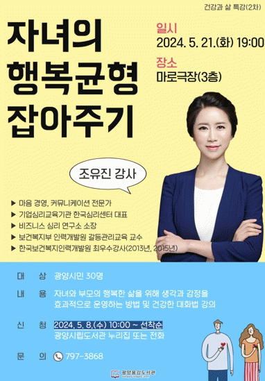 김미라 도서관과장은 “자녀를 키우는 부모님들의 고민을 해소할 수 있는 '건강과 삶' 특강을 준비했다”며 “시민들의 건강한 가정생활에 도움이 되길 바라고 많은 관심과 참여 부탁드린다”고 말했다.