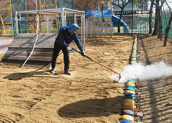 서구는 모래놀이터 7124㎡에 대해 전문장비를 활용해 고온스팀 소독을 진행할 예정이며, 소독작업은 유리.동물 배설물 등 이물질 제거, 모래 뒤집기, 전문장비를 활용한 고온 스팀 살균, 평탄 작업 순으로 이루어진다.