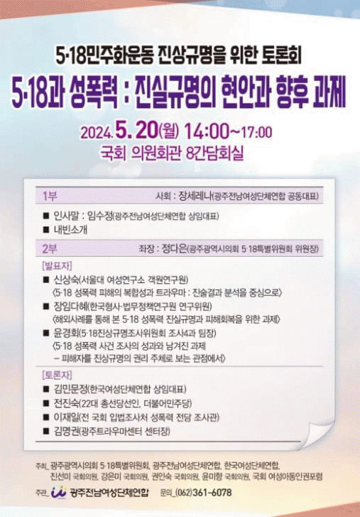 한편, 이번 토론회는 광주전남여성단체연합이 주관하고 광주광역시의회 5·18특별위원회, 광주전남여성단체연합, 한국여성단체연합, 진선미 국회의원, 강은미 국회의원, 권인숙 국회의원, 윤미향 국회의원, 국회여성아동인권포럼이 공동으로 주최 했다.