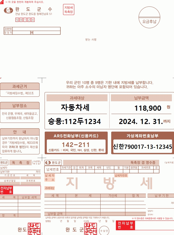 김희수 세무회계과장은 “고령층 인구 비중이 상대적으로 높은 지역 특성을 감안하여 지방세 고지서 양식을 개선하게 됐다”면서 “앞으로도 군민 눈높이에 맞는 납세 편의 시책을 지속적으로 발굴해 납세자 중심의 세무 행정 서비스를 제공하겠다”라고 말했다.