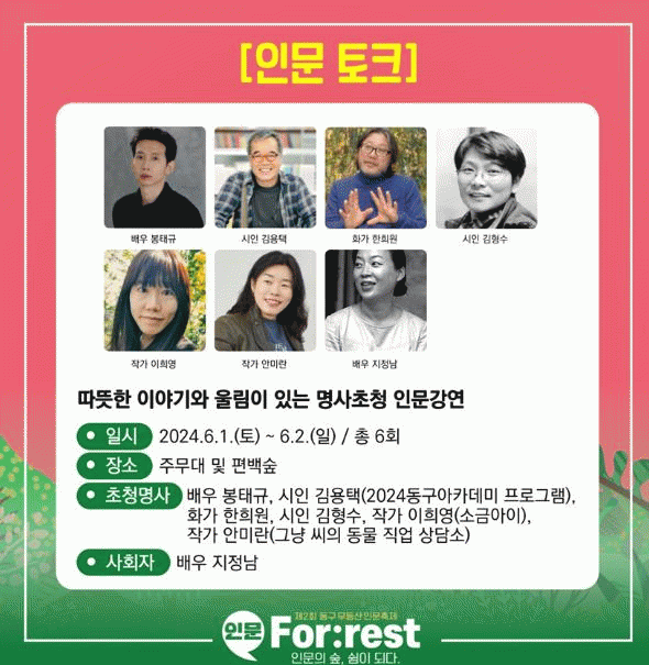 또한 동구가 ‘2024 올해의 책’으로 선정한 ‘그냥 씨의 동물 직업 상담소’의 안미란 작가와 ‘소금아이’의 저자 이희영 작가가 함께하는 자리도 열린다.