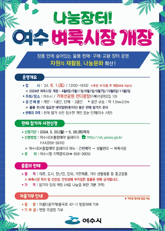 조용연 지역경제과장은 “올해도 큰 사랑은 받고 있는 ‘여수 벼룩시장’의 상반기 마지막 개장”이라며 “가족·친구들과 참여해 나눔을 실천하는 뜻깊은 추억을 만드시길 바란다”고 전했따.
