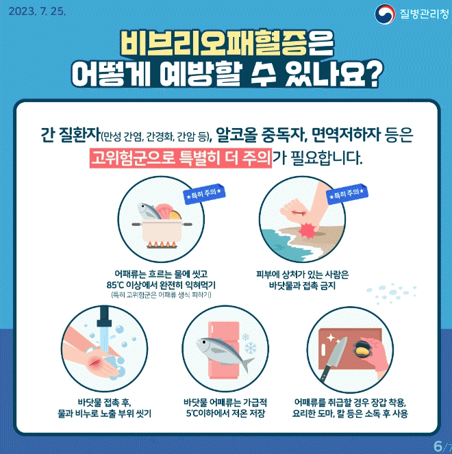 비브리오패혈증을 예방하기 위해서 ▲어패류는 충분히 익혀 먹기 ▲피부에 상처가 있는 사람은 바닷물에 접촉하지 않기 ▲어패류 관리 및 조리를 할 때 어패류는 5도 이하로 저온 보관하고 85도 이상 가열 처리하기 ▲어패류를 조리 시 해수를 사용하지 않고 흐르는 수돗물에 깨끗이 씻기 ▲어패류를 요리한 도마, 칼 등은 반드시 소독 후 사용하기 ▲어패류 다룰 때 장갑 착용하기 등의 수칙을 준수해야 한다.