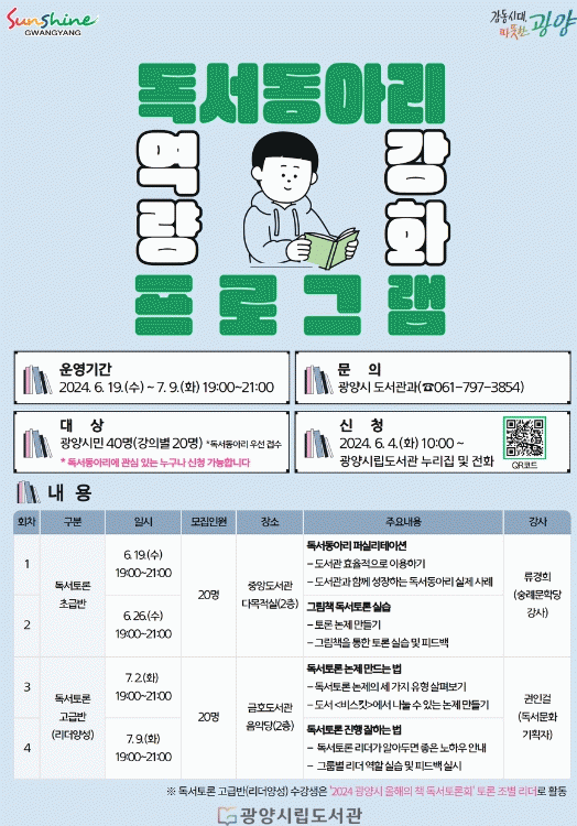 수강 신청은 6월 4일부터 광양시립도서관 누리집 또는 도서관과 도서관지원팀 전화로 가능하다.