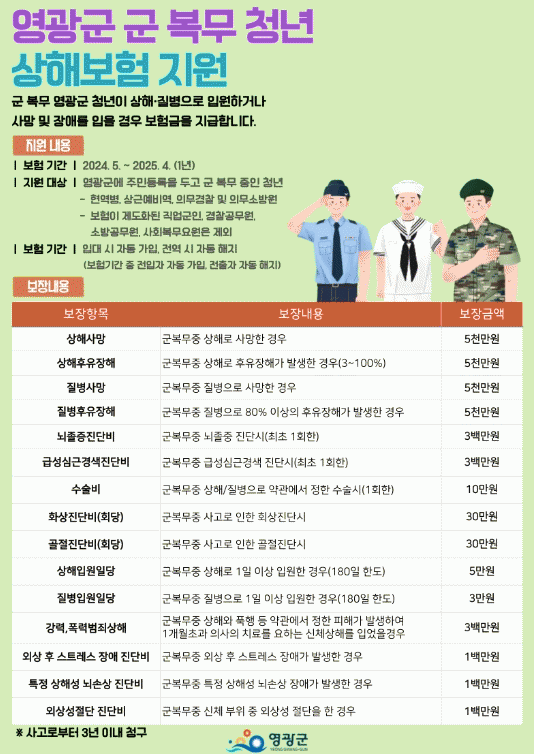 지원대상은 영광군에 주소를 두고 있는 군 복무 중인 청년으로 병역법에 따른 현역병, 상근예비역, 의무경찰 및 의무소방원이 해당되며, 보험이 제도화된 직업군인, 경찰공무원, 소방공무원, 사회복무요원은 제외된다.