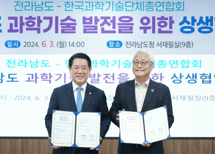 전남도와 한국과총은 이번 업무협약을 통해 과학기술을 통한 인구 감소 및 기후위기 등 사회문제 해결과 지역 미래성장동력 선점을 위해 협력하기로 했다.