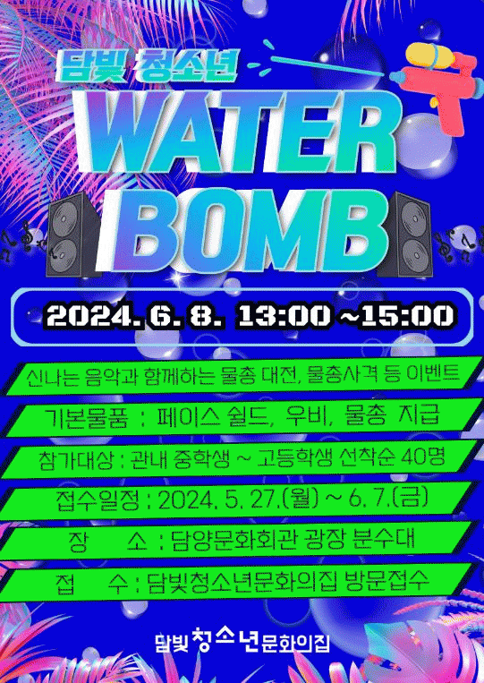 관계자는 “무더운 여름 워터밤에서 청소년들이 시원하게 스트레스를 해소했으면 한다”라며 “물을 이용한 프로그램인 만큼 안전에 유의해 진행될 수 있도록 지원하겠다”라고 전했다.