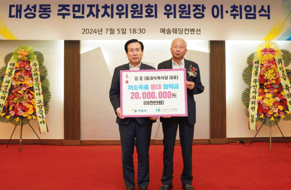 신임 김준 주민자치위원장은“어려운 가정형편에도 꿈을 향해 도전하는 학생들에게 작은 힘이 되길 바라며, 앞으로도 대성동 공동체와 이웃에 지속적인 관심과 나눔으로 지역사회와 함께 발전할 수 있는 활동을 적극적으로 모색하겠다.”고 밝혔다.