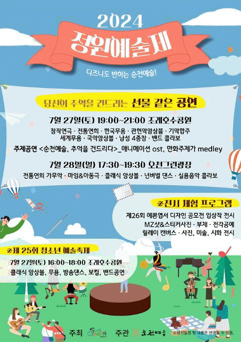 27일 조례호수공원에서는 창작연극, 전통연희, 무용, 관현악 앙상블, 남성 4중창, 밴드 공연 등 다양한 무대가 펼쳐지며, K-디즈니 순천에 걸맞는 애니메이션 OST 공연과 순천예총 회원들이 화합하는 피날레 공연이 이어질 예정이다.