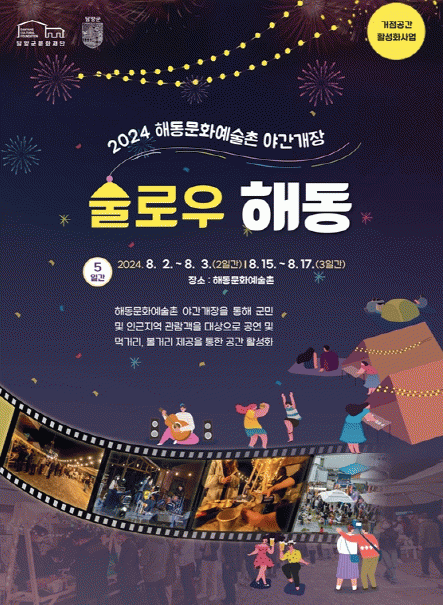 ‘술로우 해동’은 원도심 공간의 활성화를 목적으로 야간에도 문화예술을 즐길 수 있도록 기획됐으며, 과거 주조장이었던 해동문화예술촌의 콘셉트에 맞게 술을 주제로 행사를 진행한다.