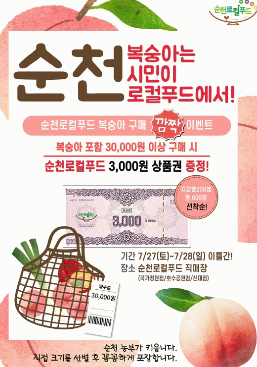 이벤트 기간 동안 복숭아를 포함해 3만원 이상 구매한 고객 중 선착순 200명에게 각 지점별로 로컬푸드 3,000원 상품권을 증정한다.