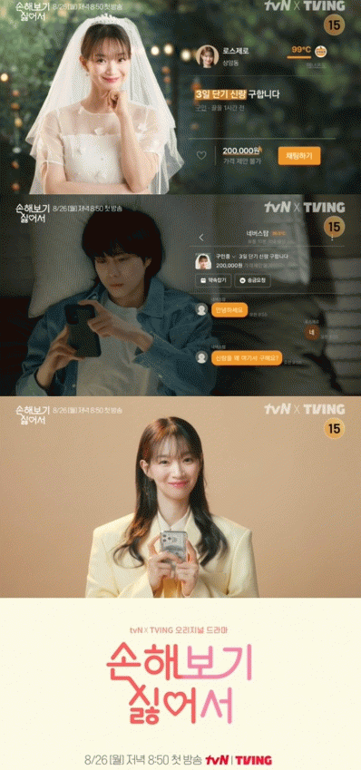 이들의 시너지가 기대되는 tvN X TVING 오리지널 드라마 ‘손해 보기 싫어서’는 오는 8월 26일(월) 저녁 8시 50분 ‘우연일까?’ 후속으로 tvN에서 첫 방송되며 TVING에서도 동시에 VOD로 서비스된다.