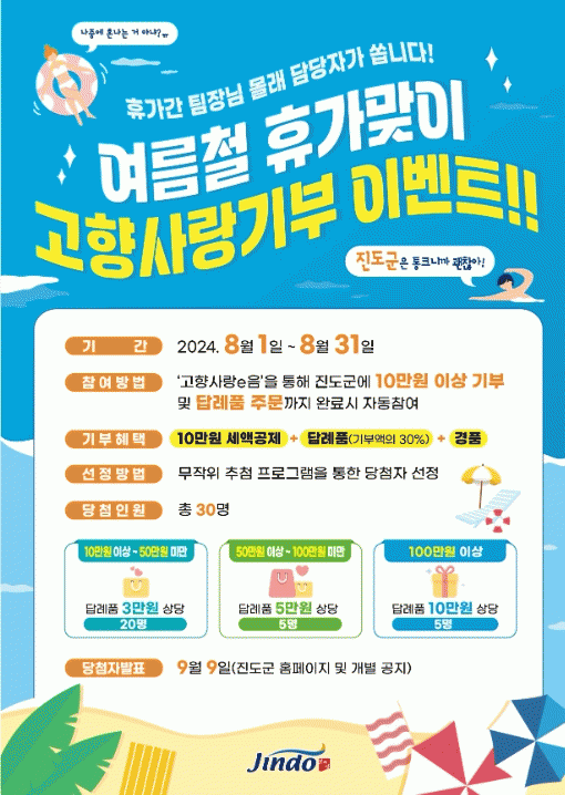 무더운 여름철에도 진도군을 향해 기부해 주시는 기부자들에게 진도군의 특별한 특산품 꾸러미를 8월 한 달간 지급해 드리는 경품 이벤트이다.