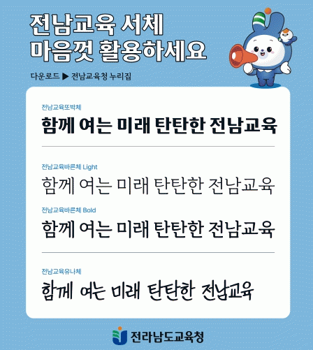 이들 서체는 전라남도교육청 대표 누리집(기관 소개-전라남도교육청 로고-전남교육 서체)에서 내려받아 누구나 무료로 사용할 수 있으며, 상업적 용도로도 활용이 가능하다.
