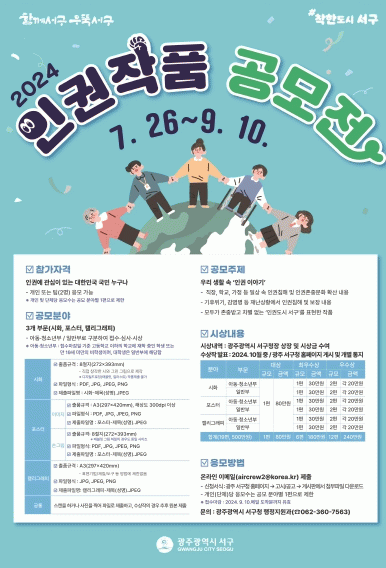 수상작은 10월 중 광주 서구청 누리집을 통해 발표하며, 향후 인권문화제 개최 시 인권작품 전시회, 홍보자료 등에 활용될 계획이다.