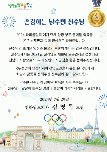 김영록 지사는 “남수현 선수는 2021년 전라남도 새천년 으뜸인재로 선정된 전남의 자랑으로서, 우리 도민의 자긍심을 한층 높여줬다”며 “국위선양에 앞장서며 전남도민을 비롯한 온 국민에게 희망과 감동을 전해준 선수님께 깊이 감사드린다”고 말했다.
