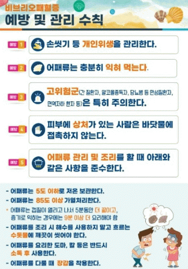 비브리오패혈증 예방을 위해 ▲어패류는 반드시 85도 이상에서 익혀 먹기 ▲어패류 5도 이하 저온보관 및 취급시 장갑 착용 ▲요리한 칼이나 도마는 소독 후 사용하기 ▲피부에 상처가 있는 경우 바닷물 접촉 금지 등이 있다.