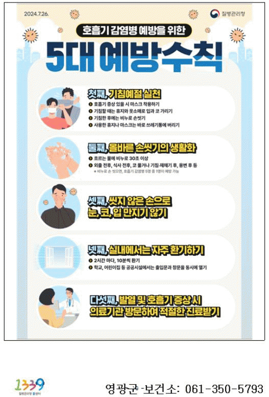 보건소 관계자는 “호흡기 감염병 예방을 위해 기침할 때 휴지나 옷소매로 입과 코를 가리고 기침하는 기침예절과, 올바른 손씻기 생활화, 씻지 않는 손으로 눈, 코, 입 만지지 않기, 실내에서 자주 환기하기, 발열 및 호흡기 증상이 있을 시 의료기관 방문하여 적절한 진료 받기 등 예방수칙준수의 생활화를 당부한다고 ”고 밝혔다.