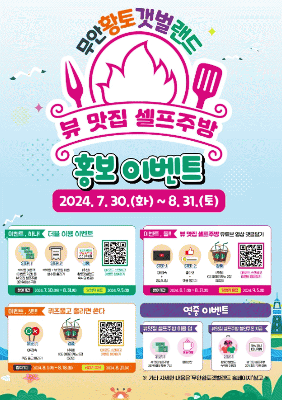 이벤트 내용은 ▲ 황토갯벌랜드 숙박객 중 뷰맛집 셀프주방 일정 금액 이상의 구매자 중 추첨을 통해 5명에게 숙박 이용권을 주는 ‘더블 이용’ 7월30일~8월31일 ▲‘좋아요’와 함께 댓글을 달고, 네이버 폼을 통해 인증하면 추첨을 통해 8천원 상당의 모바일 쿠폰을 주는 ‘뷰맛집 셀프주방 유튜브 영상 댓글 달기’ 8월1일~8월31일 ▲QR코드에 접속하여 퀴즈를 풀고 올리면 커피쿠폰을 제공하는 ‘퀴즈풀고 올리면 쏜다’ 8월1일~8월18일 로 구성되어 있다.