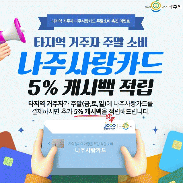 여기에 7월 26일부터 오는 8월 18일까지 금요일과 주말 나주사랑카드 결제금액이 15만원 이상인 소비자 40명을 추첨해 1만원을 추가 적립해줄 계획이다.