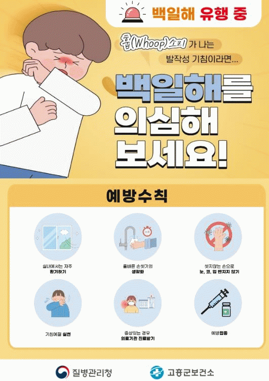 백일해는 2급 감염병으로 가벼운 기침, 가래, 콧물로 시작해 숨을 들이쉴 때 ㅎㅜㅂ(whoop) 소리가 나는 특징이 있으며, 예방수칙으로는 예방접종(총 6회) 받기, 흐르는 물에 30초 이상 손 씻기, 기침할 때 휴지나 옷소매로 입과 코 가리기, 씻지 않은 손으로 눈·코·입 만지지 않기, 기침 증상이 있으면 의료기관 진료받기 등이 있다.