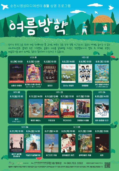 8월 첫째 주 어린이들의 일상 속 문화콘텐츠 친화력을 높이고 다양한 문화적 경험을 확대하기 위해 ‘2024 순천어린이영화주간’사업의 일환으로 영화 '남매의 여름밤', '핑크퐁 시네마콘서트 2 원더스타 콘서트 대작전', '막걸리가 알려줄거야'를 상영한다.