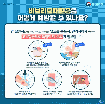 비브리오패혈증을 예방하기 위해서 △어패류는 충분히 익혀 먹기 △피부에 상처가 있는 사람은 바닷물에 접촉하지 않기 △어패류는 5도 이하로 저온 보관하고 조리할 때 85도 이상 가열 처리하기 △어패류를 조리 시 해수를 사용하지 않고 흐르는 수돗물에 깨끗이 씻기 △어패류를 조리한 도마, 칼 등은 반드시 소독 후 사용하기 △어패류 다룰 때 장갑을 착용하기 등의 수칙을 준수해야 한다.