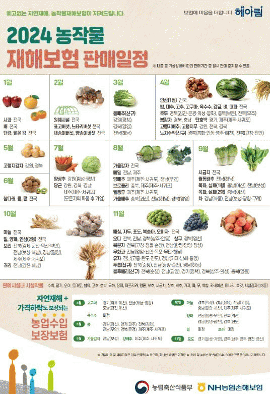 보험 가입 가능 품목을 재배하더라도 품목별 파종·수확시기에 따라 가입 시기가 다른 만큼 재배작물의 가입 시기를 꼭 확인해야 한다.