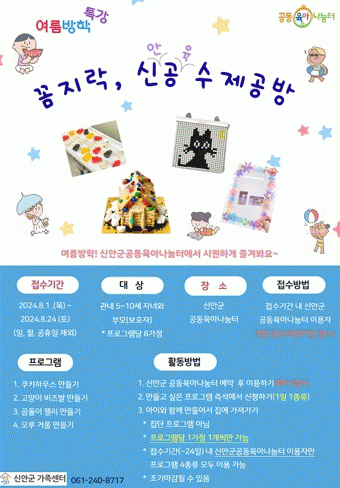 신안군 공동육아나눔터에서는 매월 주말 상시프로그램을 운영하고 있으며, 부모 자녀와의 친밀도를 높이고, 자녀의 사회성 발달과 건강한 성장 발달을 지원하여 부모의 양육 부담을 경감하고 지역사회의 돌봄 문화 확산에 앞장서고 있다.