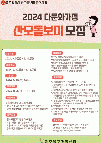 대상은 광주시에 거주하면서 등록된 결혼이주여성과 고려인 산모이며, 출산 후 60일 이내에 돌봄을 신청할 수 있고 미숙아와 선천성 이상아 출산 등으로 입원한 경우 퇴원일로부터 60일 이내 신청하면 된다.