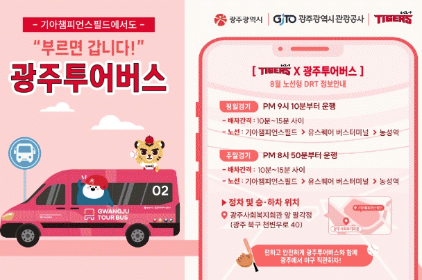 광주광역시는 이용객이 원하는 정류장에서 앱으로 호출하면 찾아오는 ‘광주투어버스’의 정류장에 기아챔피언스필드를 8일부터 추가하고, 기아 타이거즈 구단과 협업해 각종 홍보와 이벤트를 추진한다.
