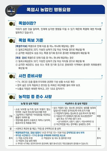 폭염 피해 최소화를 위한 주요 품목별 관리대책으로는 ▲벼는 기온이 상승함에 따라 흡수가 억제되는 규산과 칼륨을 증시하고, ▲채소 등 주요 밭작물은 스프링클러로 관수하여 지온상승을 억제시키고, 적기 수확 하여야 한다.