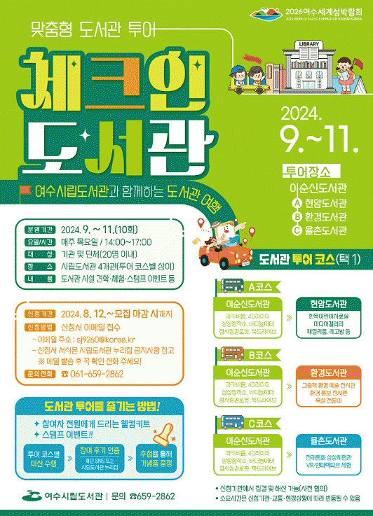 ‘체크인 도서관’은 시민들의 도서관 이용을 유도하기 위해 ‘여행’을 주제로 여수시립도서관 4개관(이순신·현암·환경·율촌도서관)을 구간별로 돌아보며 도서관별 특화 시설과 콘텐츠를 체험하는 프로그램이다.