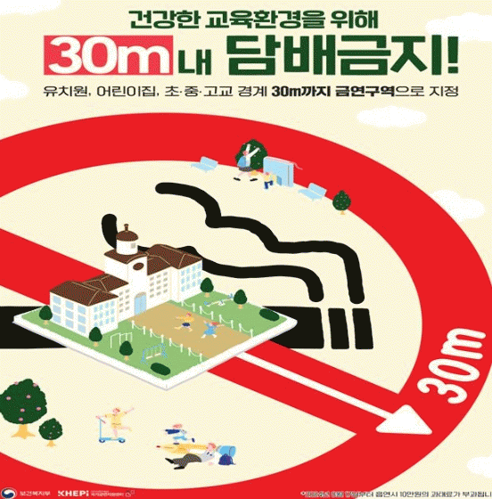 기존 어린이집, 유치원 시설 경계선에서 10미터 이내였던 금연 구역이 어린이집, 유치원 및 학교 시설의 경계선으로부터 30미터 이내로 확대된 것이다.