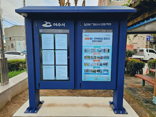 이번에 설치한 전자게시판은 읍면동 규모를 고려하여 55인치 터치스크린 2면으로 구성됐으며, 오전 7시부터 오후 9시까지 시정 소식과 법정 고시·공고 등을 송출한다.