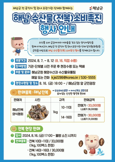 이에따라 군은 군 공직자는 물론 관내 유관기관 및 사회단체 등이 함께 하는 전복 소비촉진 행사를 추진할 계획으로, 오는 12일까지 사전주문을 받아 16일 군민광장에서 현장배부를 실시한다.