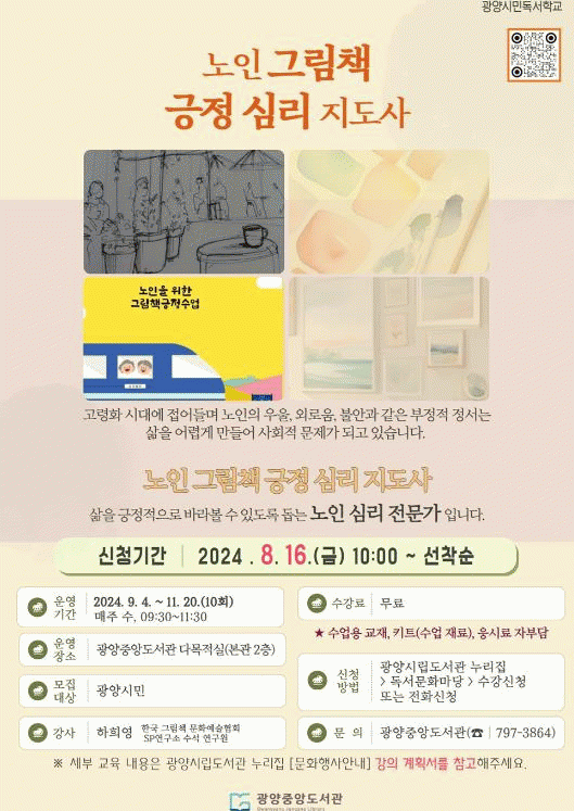 ‘노인 그림책 긍정 심리 지도사’는 노인 심리 전문가 양성 과정으로 고령화 시대 우울과 불안 등 부정적인 정서로 어려움을 겪는 노인들이 그림책 읽기를 통해 스스로 삶을 긍정적으로 바라볼 수 있도록 돕는다.