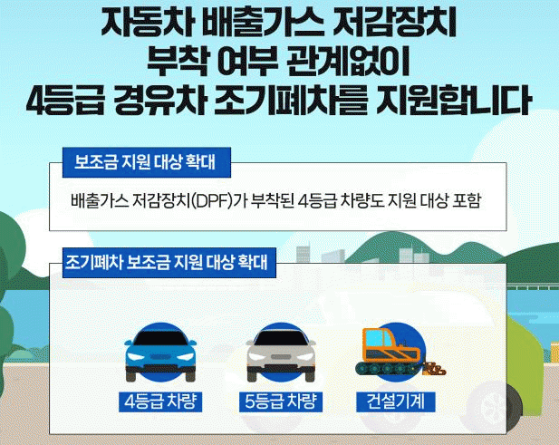 한편, 올해부터는 그간 지원에서 제외됐던 매연저감장치(DPF)가 부착된 4등급 경유차도 조기폐차 지원 대상에 포함됐다.