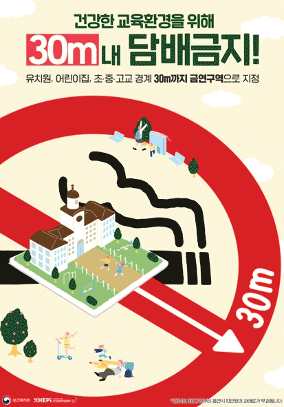국민건강증진법 개정에 따른 이번 조치는, 유치원·어린이집은 10m, 학교는 제한이 없던 기존 시설 경계선 규정을 넓게 확장한 것.