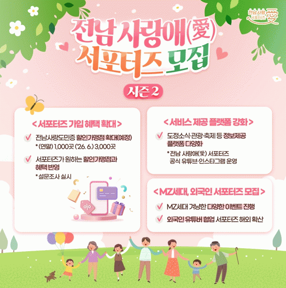 ‘전남 사랑애 서포터즈 모집 시즌2’는 전남사랑도민증 할인가맹점 확대와 정보제공 플랫폼 다양화를 통한 서비스의 질적 성장, 엠지(MZ)세대와 외국인을 주요 타깃으로 다양한 이벤트 진행 및 유튜브·인스타그램 등 누리소통망(SNS) 홍보 등으로 자발적 가입을 이끌어낼 방침이다.