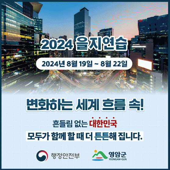 영암군은 을지연습 기간 △공무원 비상소집 △전시 전환 절차 △상황 조치 도상 △전시 현안 과제 토의 △민방공 대피 등 훈련으로 충무계획의 실효성을 검증하고, 비상사태시 기관별 대응 역량을 점검한다.