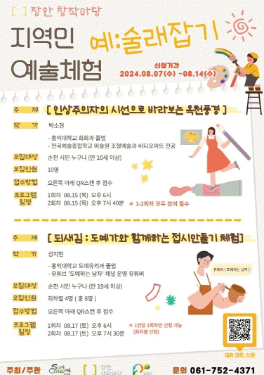 시 관계자는 “장안창작마당 레지던시 입주 작가들은 장안창작마당에 머물면서 순천의 다양한 모습을 예술적으로 풀어가는 작업들을 해나가고 있다”며 “예:술래잡기 프로그램을 통해 작가들에게는 순천의 또 다른 모습을 담을 수 있는 기회가 되고 순천 시민들에게는 장안창작마당이 예술로 교감하는 공간이 되도록 노력하겠다”고 전했다.